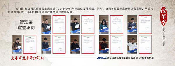 蛇年將逝,馬年將臨。2013年11月2日,浙江漢達機械有限公司的年度戰(zhàn)略會議拉開了帷幕。公司總經理斗志激昂,領銜宣讀了2014年年度戰(zhàn)略發(fā)展規(guī)劃。公司的經理、車間主任、主管等各級領導們紛紛跟起簽名宣誓。