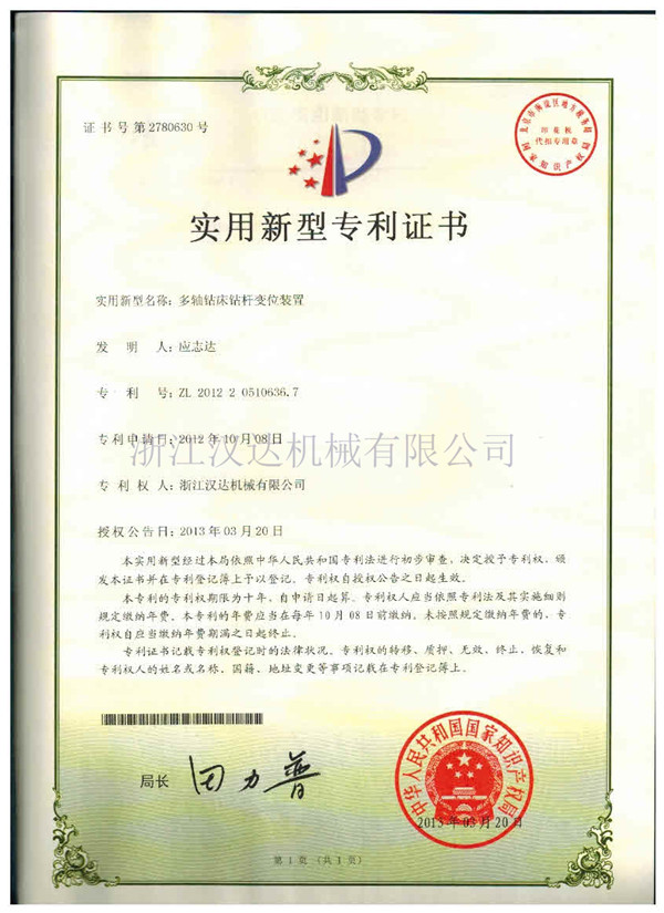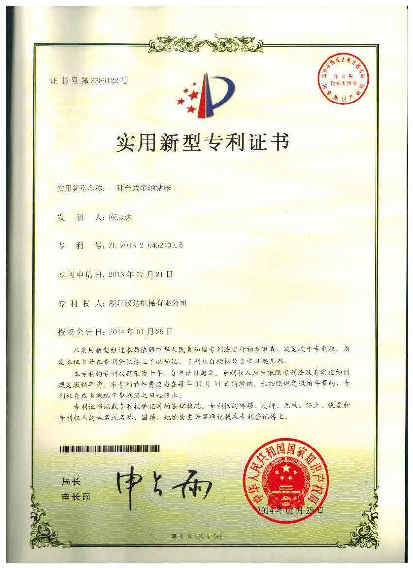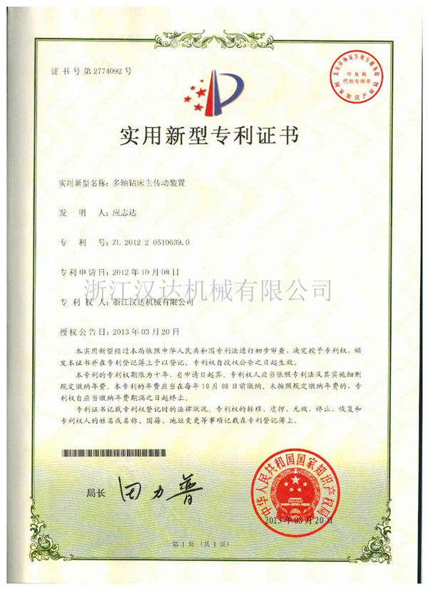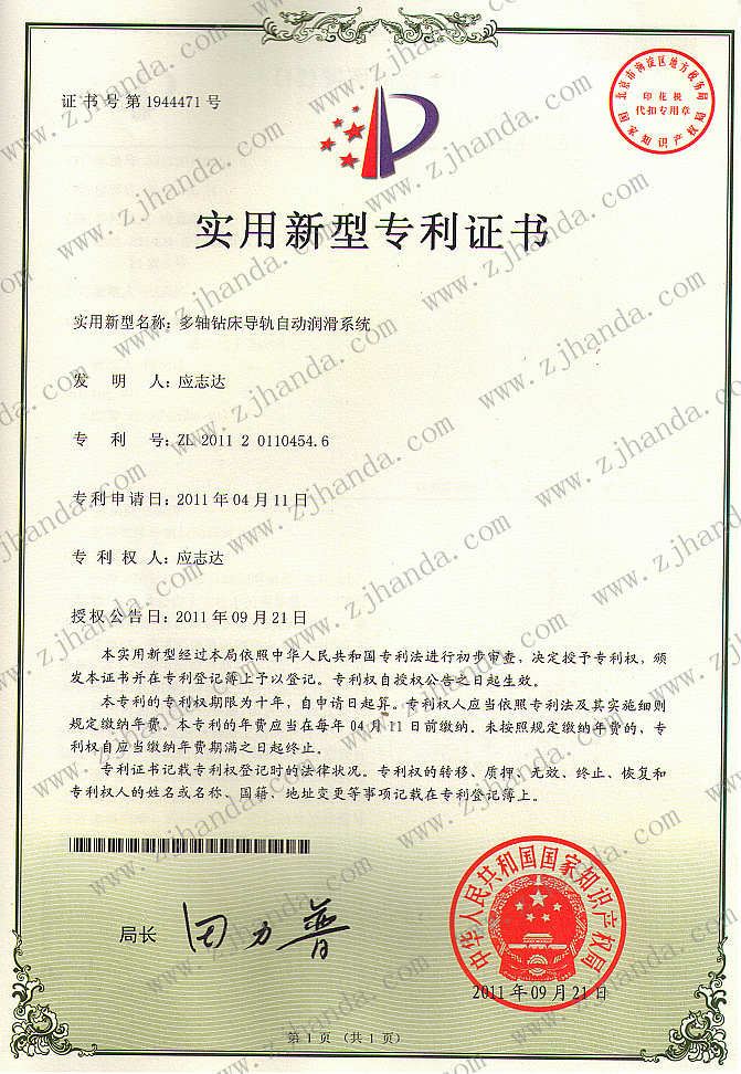 多軸鉆床潤(rùn)滑系統(tǒng)新型專利證書